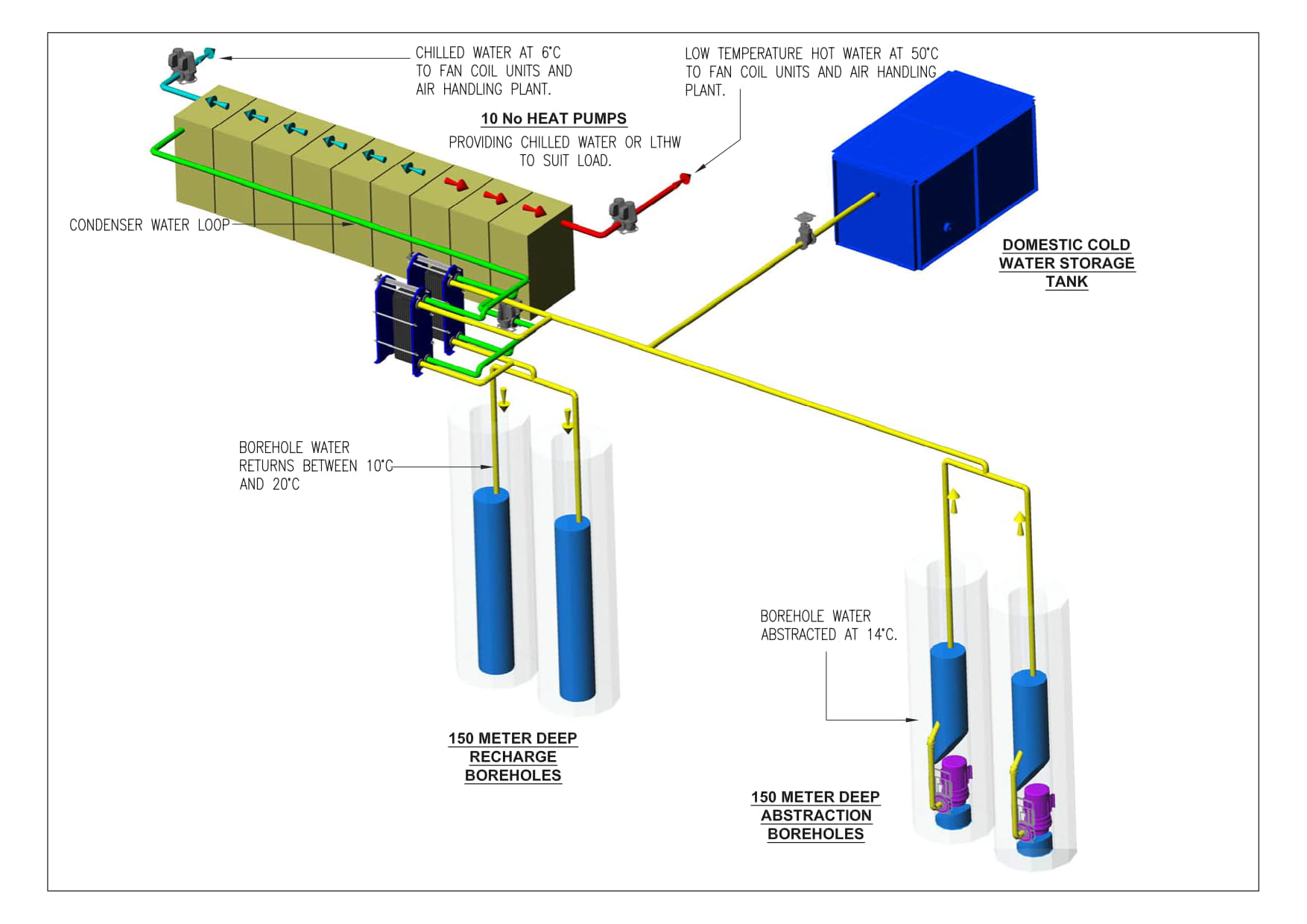 Four 150m boreholes were installed in the rear car park, enabling groundwater abstraction and reinjection. The system uses plate heat exchangers and reversible heat pumps to deliver simultaneous heating and cooling with COPs up to 6.0—achieving ~40% energy savings compared to conventional systems.